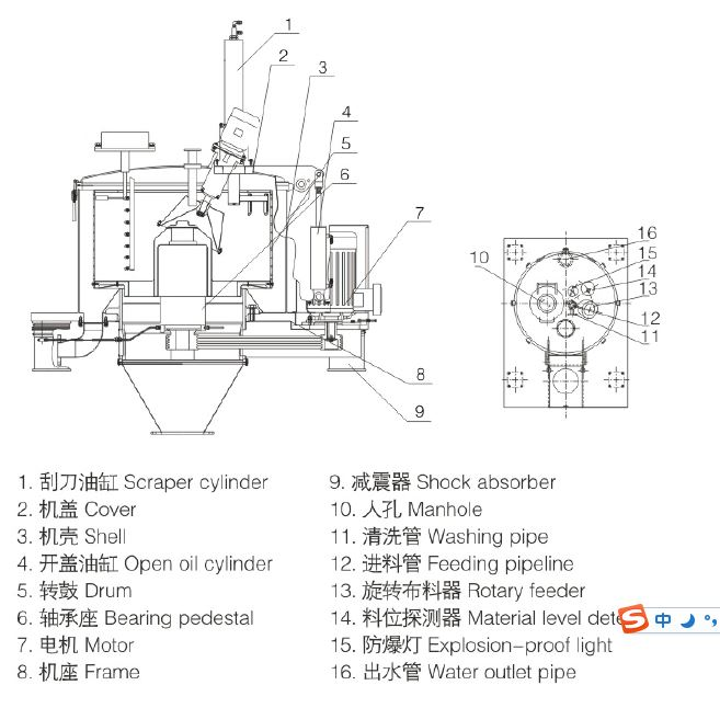 ■ 安全保护:转速检测,过振动保护,开盖保护,电机过载过热保护,刮刀旋转,升降机械电气双重控制,刮刀与转鼓的联动锁定。